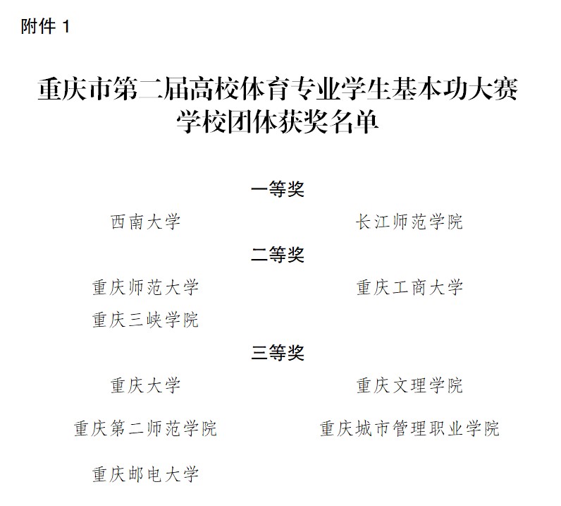 近日,重庆市教育委员会公布了第二届重庆市高校体育专业学生基本功大赛的获奖结果,我校派出的12名参赛学生全部获得等级奖,并荣获团体总分一等奖,这是我校连续第二年获得该奖项,也是体育专业六维卓越人才培养理念的生动实践。其中,3名同学获个人全能一等奖,8名同学获个人全能二等奖,1名同学获三等奖。