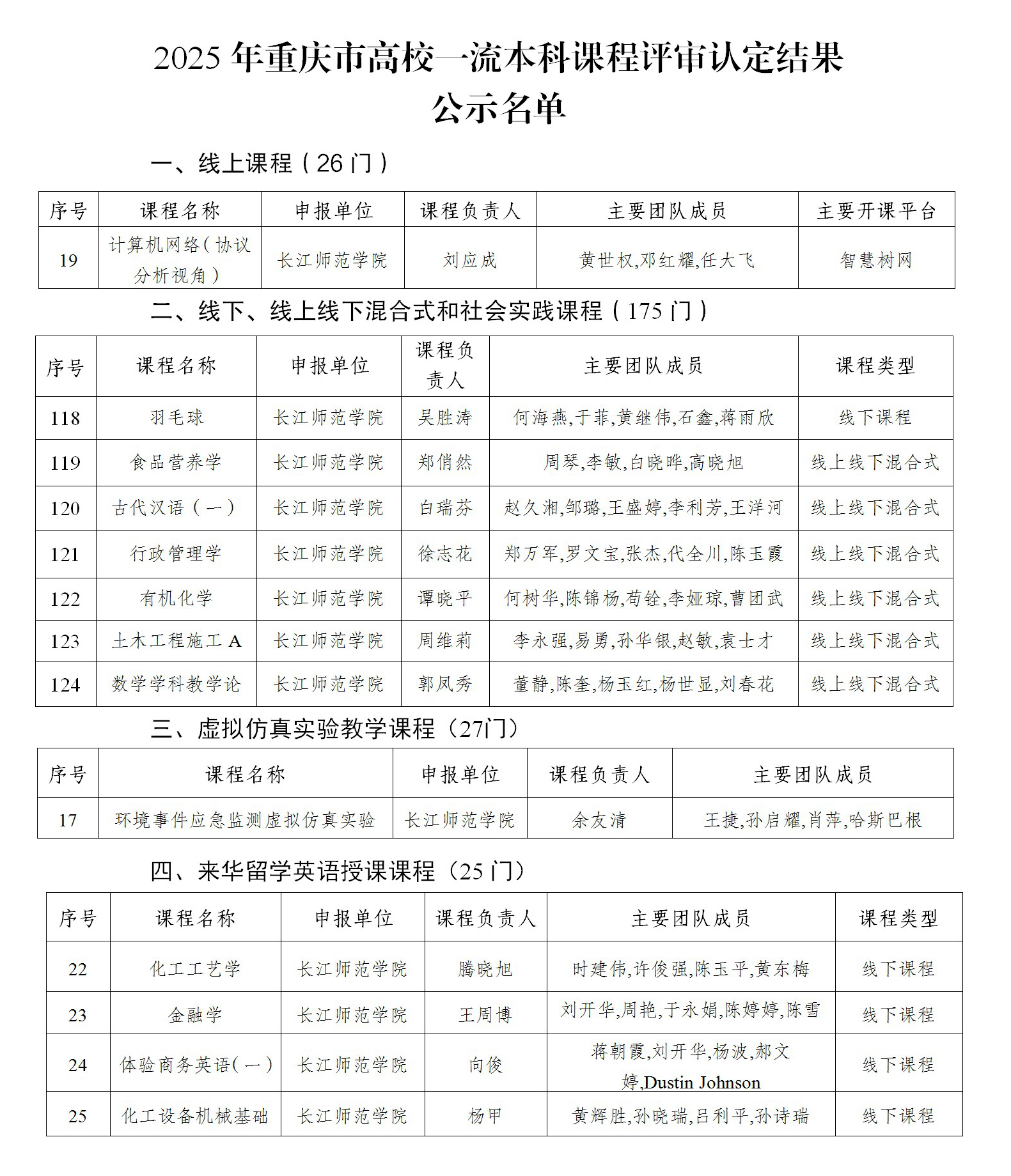 近日,重庆市教育委员会正式公示2025年重庆市高校一流本科课程认定结果,我校《计算机网络》等13门课程成功入选。其中线上课程1门、线下课程1门、线上线下混合式课程6门、虚拟仿真实验教学课程1门、来华留学英语授课本科课程4门,入选数量位居同生态位院校前列。