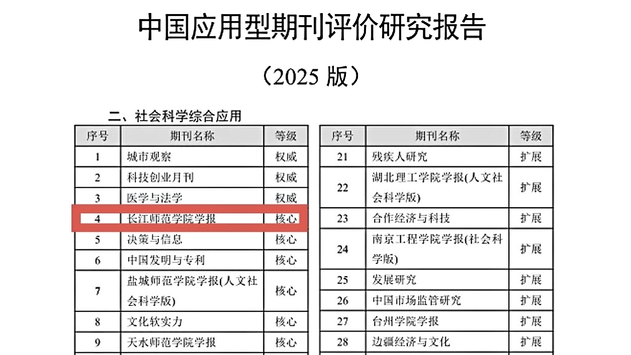 《长江师范学院学报》在社会科学综合应用类40种期刊中位列第4位,被评为CACJ中国应用型核心期刊。4月10日,武汉大学中国科学评价研究中心、武汉理工大学数字出版智能服务技术教育部工程研究中心联合发布《中国应用型期刊评价研究报告(2025版)》。《长江师范学院学报》参评应用型期刊,有利于发挥期刊的社会价值,实现“以评促建”“以评促改”,支持学校的应用型转型发展。