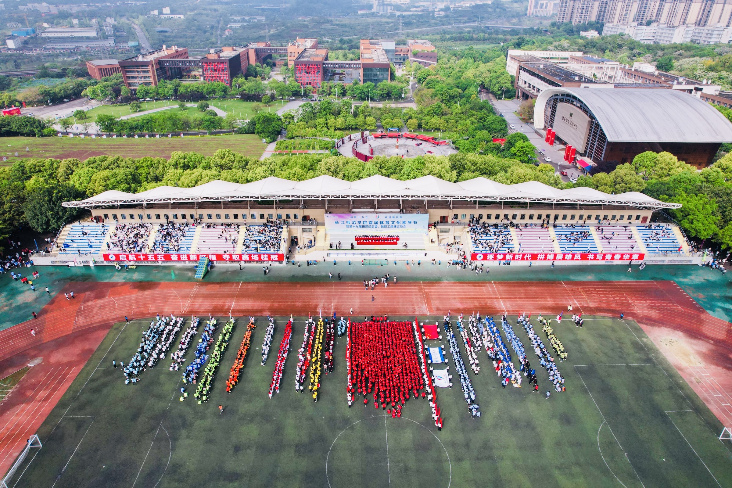 入场式上,各二级学院紧扣学科专业特色,带来了精彩纷呈的展演。音乐学院学子身着七彩民族服饰,苗银脆响、笑靥飞扬,生动呈现民族文化之美与民族团结之韵;美术学院将马年意象融入书画创作,以专业底蕴呼应律动歌舞;传媒学院、大数据与智能工程学院、机器人工程学院、经济与管理学院等学院聚焦人工智能发展趋势,以富有想象力的表演诠释青年科创热忱;材料科学与工程学院携“长师——上岸”新能源汽车模型亮相,彰显学科特色与创新自信;体育与健康科学学院带来创意武术表演,将传统武学与现代运动科学有机融合,高难度动作燃爆全场;长江科创学院自主研制的飞机模型凌空而过,空中彩带与彩烟交织,搭配舞蹈编排,直观展示学校科创育人成果;国际学院方阵载歌载舞,不同国籍学子携手同行,在欢快的节拍中传递跨越山海的友谊,洋溢着来华留学、知华友华的青春热忱;学校首届研究生代表队步伐坚定地走过主席台,昂扬之姿中饱含笃行治学、奋勇争先的初心与担当。