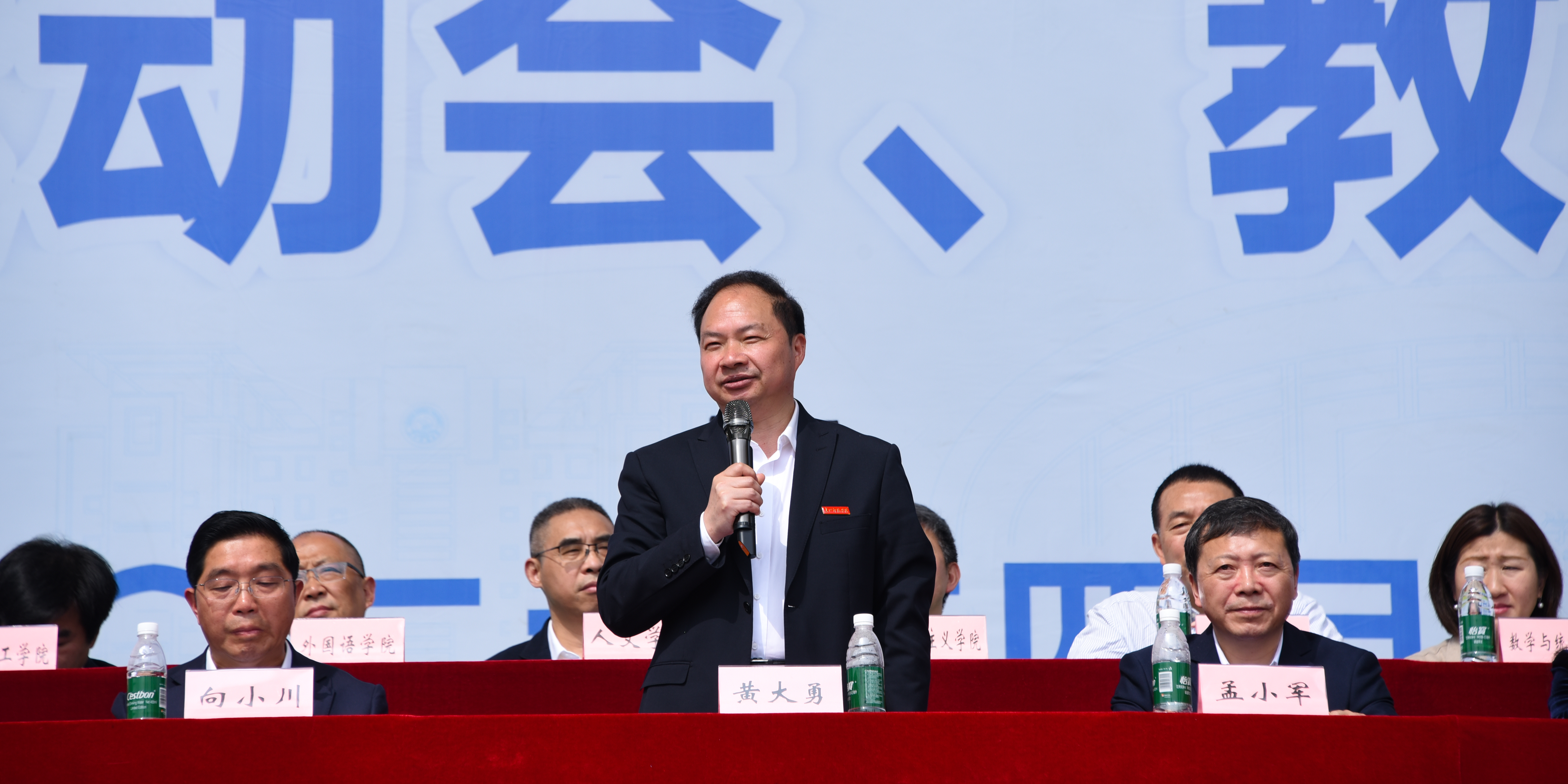 4月16日上午,学校首届体育文化素质节暨第十九届田径运动会、教职工趣味运动会在行健体育场开幕。党委书记黄大勇,校长孟小军,党委副书记向小川,副校长李柳柏出席开幕式。各职能部门、二级学院负责人及万余名师生参加活动。黄大勇宣布运动会开幕,孟小军致开幕辞,李柳柏主持开幕式。